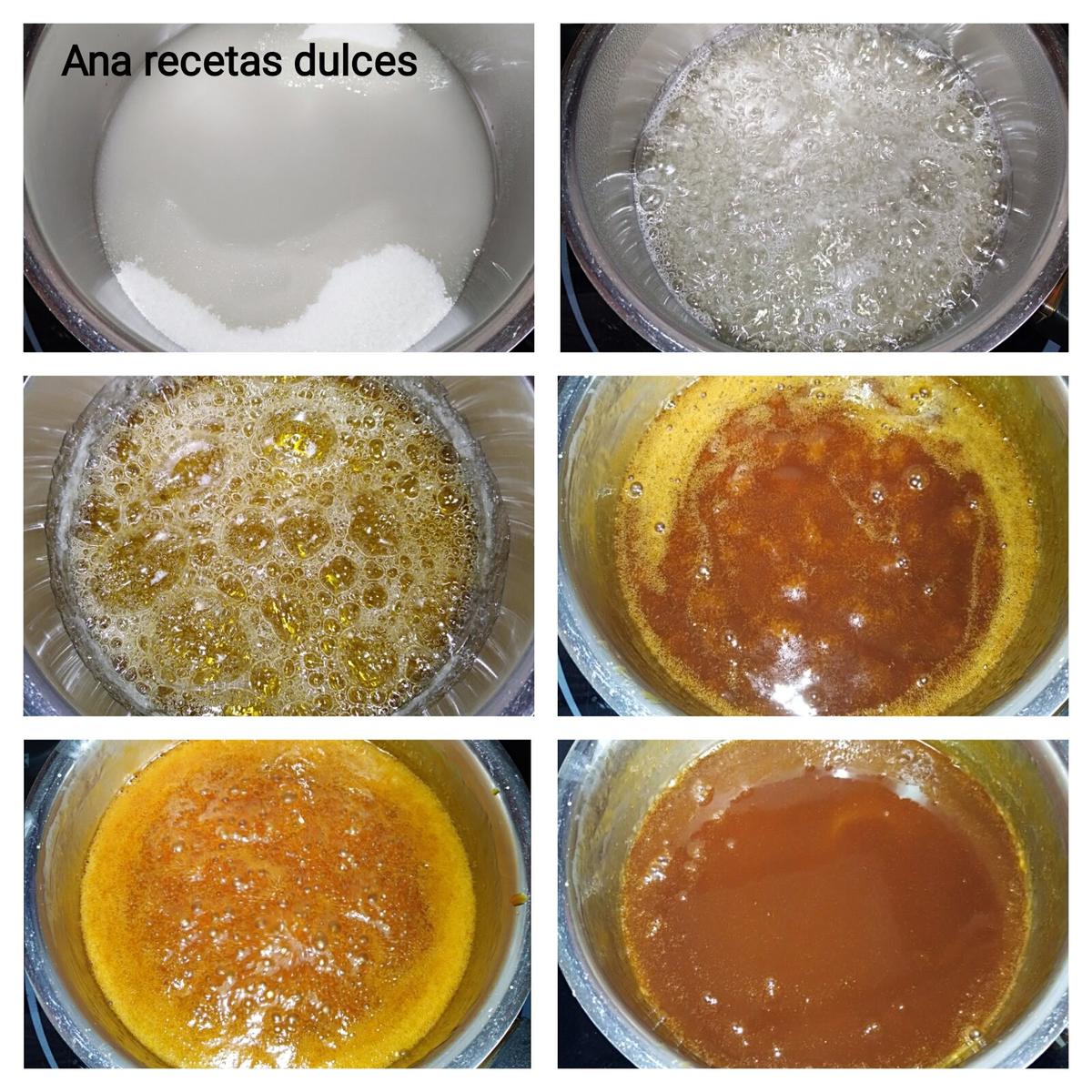 Echamos en un cazo el azúcar y el agua, ponemos a fuego medio y dejamos que se haga el caramelo sin moverlo en ningún momento.Cuando coja un bonito color dorado (no dejar que el caramelo se ponga muy oscuro porque amargara), añadimos la nata (crema de leche) poco a poco con mucho cuidado ya que salpica y suelta mucho vapor al echar la nata (crema de leche) y nos podemos quemar.