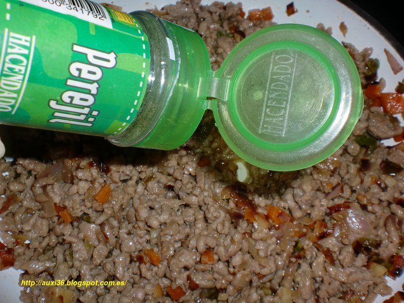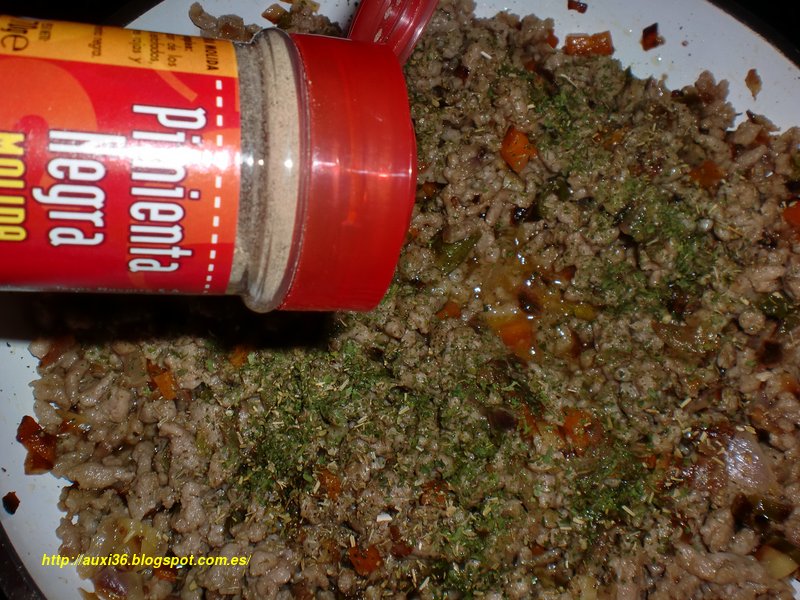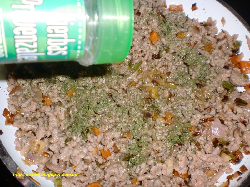 Carne picada de ternera,tomate,pimiento verde,zanahoria,cebolla,ajos,especias ,vino blanco ,aceite y sal
