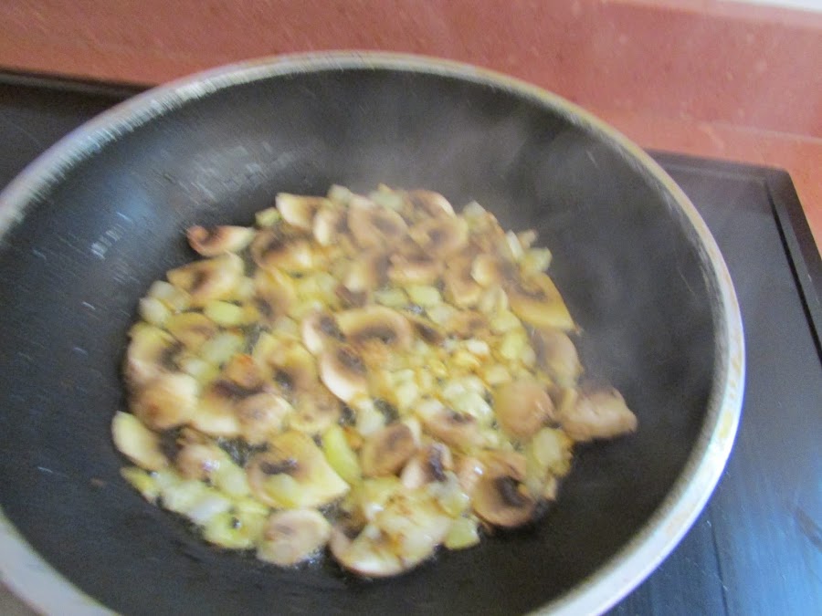La pochamos un poco y le añadimos los champiñones troceados, los salteamos, le echamos el chorrito de brandy y lo flambeamos.