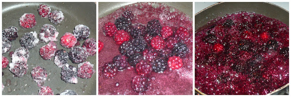 En una sartén ponemos las moras y el azúcar, dejamos que se caliente un poco y vertemos el orujo y las gotitas de limón (para el color).