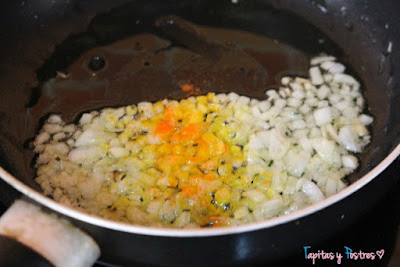 Cuando la cebolla esté transparente agregamos el colorante y removemos bien.