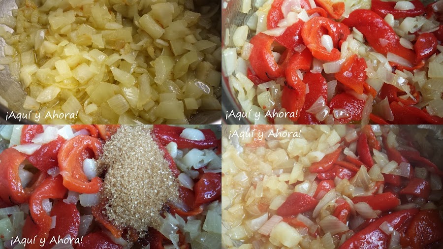 2. Escurrimos los pimientos asados y se lo añadimos a la sartén con la cebolla, mezclamos bien.
