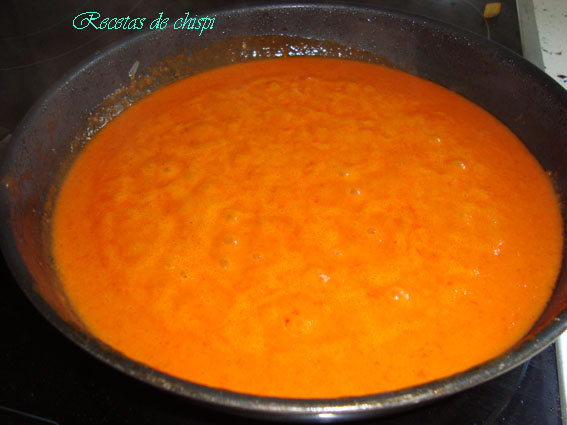 Cuando se vean blanditas añadir la harina y darle unas vueltas para que se le quite el sabor a crudo, agregar el tomate frito y el vino, dejar que se consuma el alcohol y añadir un poco de agua, cuando haya cocido un poquitin pasar a una batidora y triturar, pasar de nuevo a la sarten echar la sal al gusto y cocinar unos minutos, si está muy espesa se le pude añadir más agua.