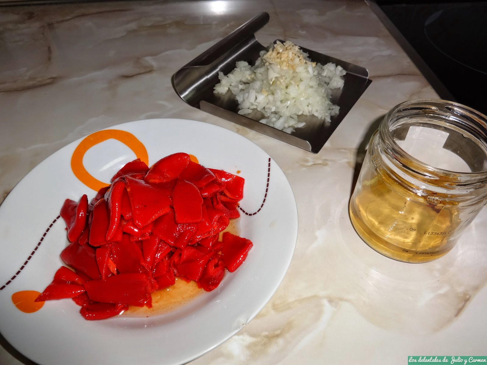 Picaremos la cebolla y el ajo finamente (tampoco hace falta picarlos demasiado, ya que después lo batiremos todo). Los pimientos, los cortaremos en trozos, dejando el aceite que vienen en la lata, que usaremos mas tarde.
