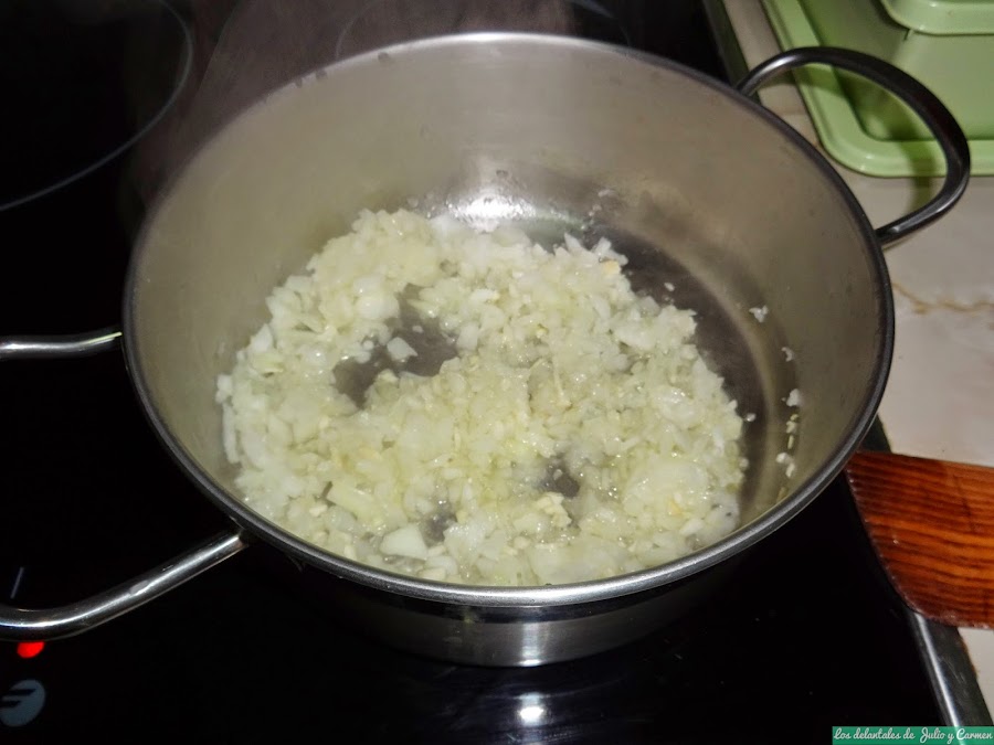En una sarten, a fuego medio-bajo, pondremos a pochar la cebolla y el ajo. Cuando comience a estar dorada la cebolla, echaremos los pimientos junto con su aceite, subiendo un poco el fuego. Removeremos y dejamos que reduzca a la mitad el caldo.
