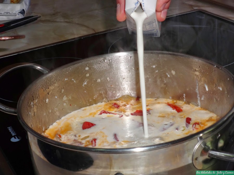 Cuando lo tengamos reducido, vertemos la nata (crema de leche) y removemos durante unos minutos, dejando que se integren bien todos los ingredientes.