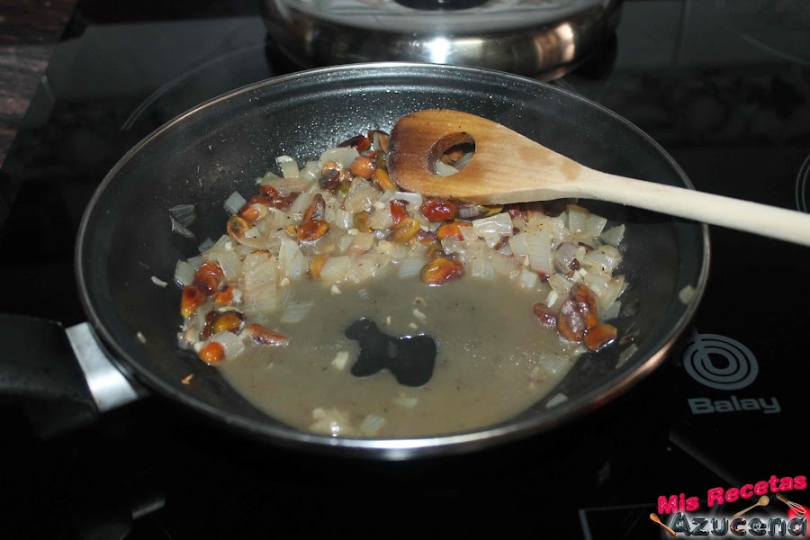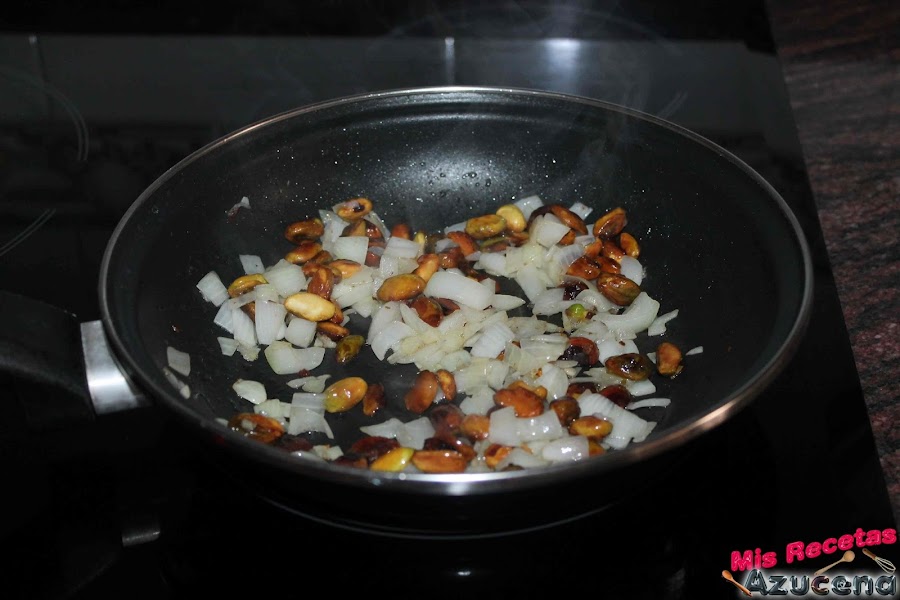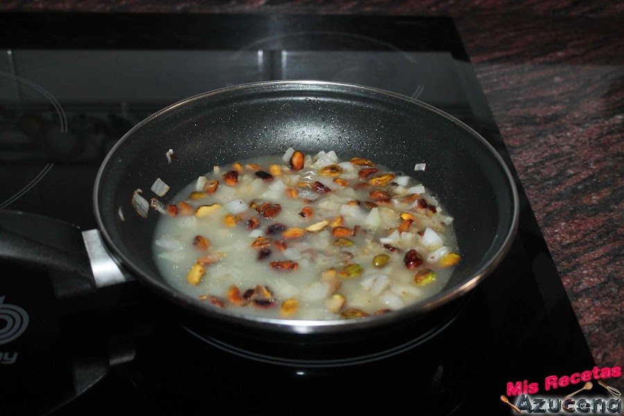 A continuación añadiremos la cebolla y el ajo juntos, salpimentamos y bajamos el fuego a fuego bajo y le damos 2 minutos y removemos de vez en cuando para que no se nos quemen los pistachos.