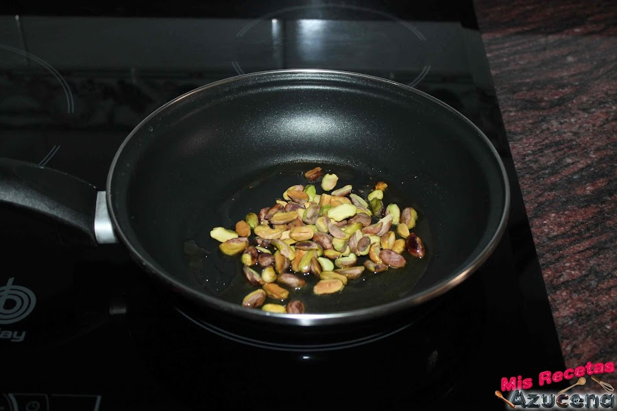 Los pistachos los pelaremos y le quitaremos toda la piel que podamos, una vez los tengamos listos pondremos una sartén al fuego, a fuego medio y le pondremos unas tres cucharadas de aceite de oliva y los pistachos, sin que el aceite llegue a ponerse muy caliente le damos vueltas continuamente durante unos 30 segundos.