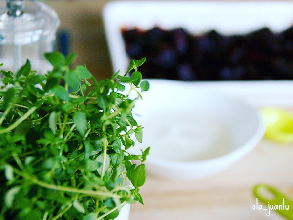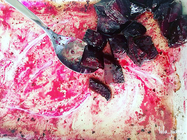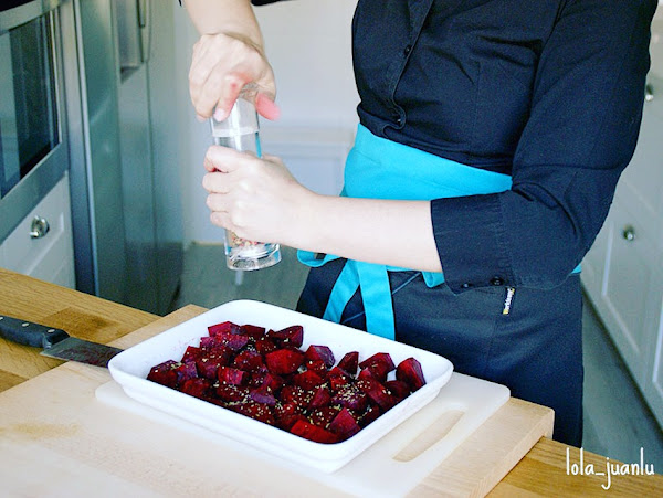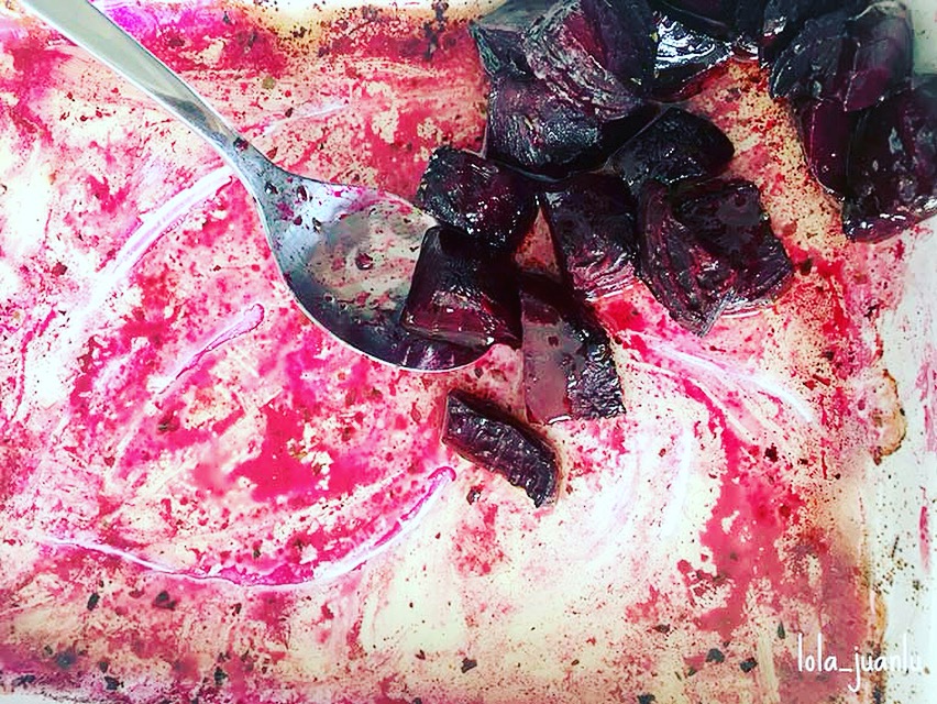 El blanco de la sal y posteriormente el verde del orégano rompen con el color intenso de la remolacha, mientras que el aceite le da brillo.