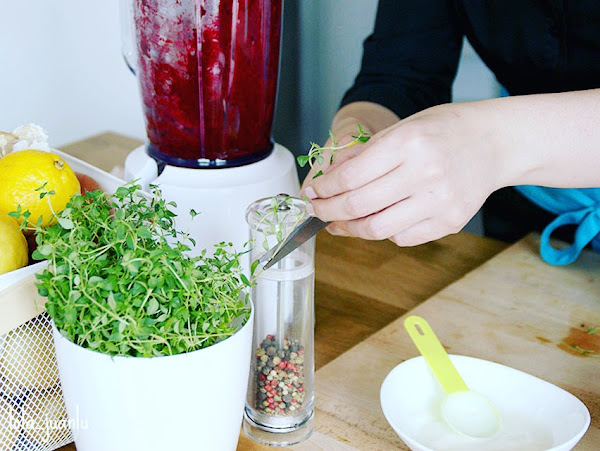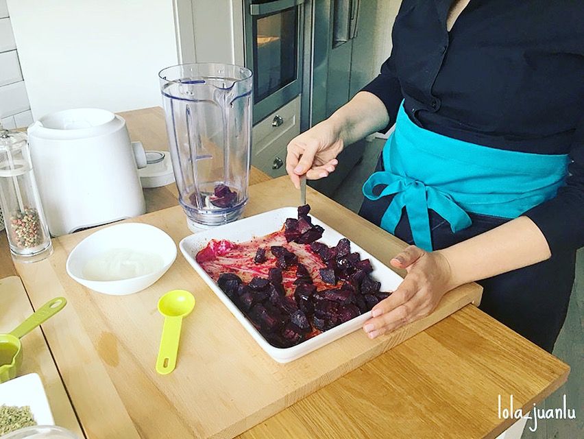 Picamos finamente el perejil y reservamos. Sacamos el yogur de la nevera. Agregamos éste y el perejil a la pasta de remolacha y mezclamos. Este paso lo podemos hacer en un bol aunque yo lo suelo hacer con el procesador de alimentos.