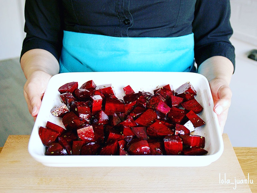 Colocamos los trozos de remolacha en una fuente para hornear. Añadimos el aceite, el orégano, la sal y la pimienta y mezclamos bien.