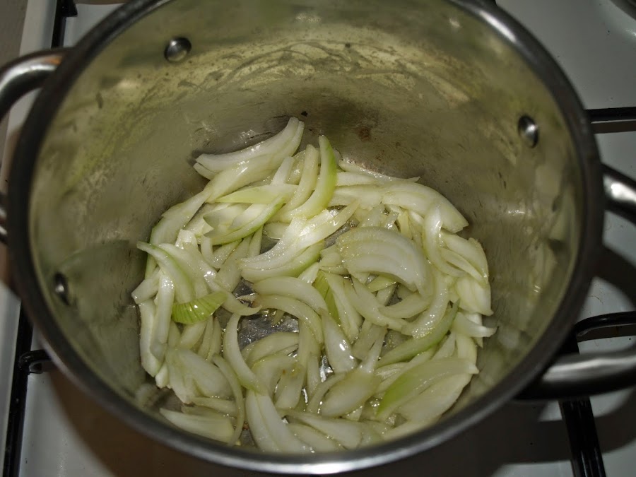 - Ponemos a calentar un poco de aceite de oliva en una cacerola. Cortamos la cebolla en tiras y la añadimos.