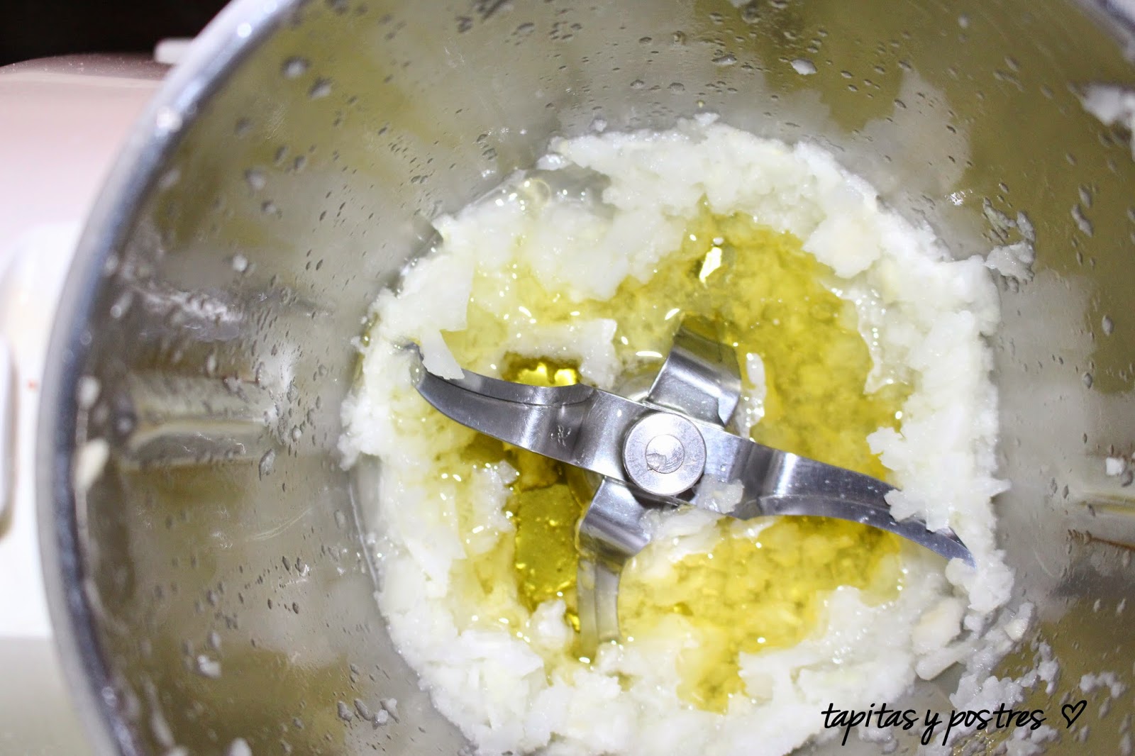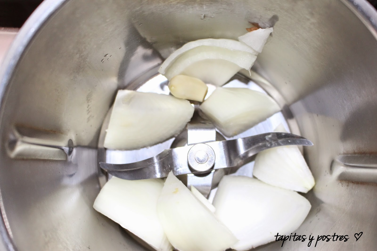 Ponemos en el vaso el ajo y la cebolla en cuartos y trituramos 7 segundos a velocidad 5.