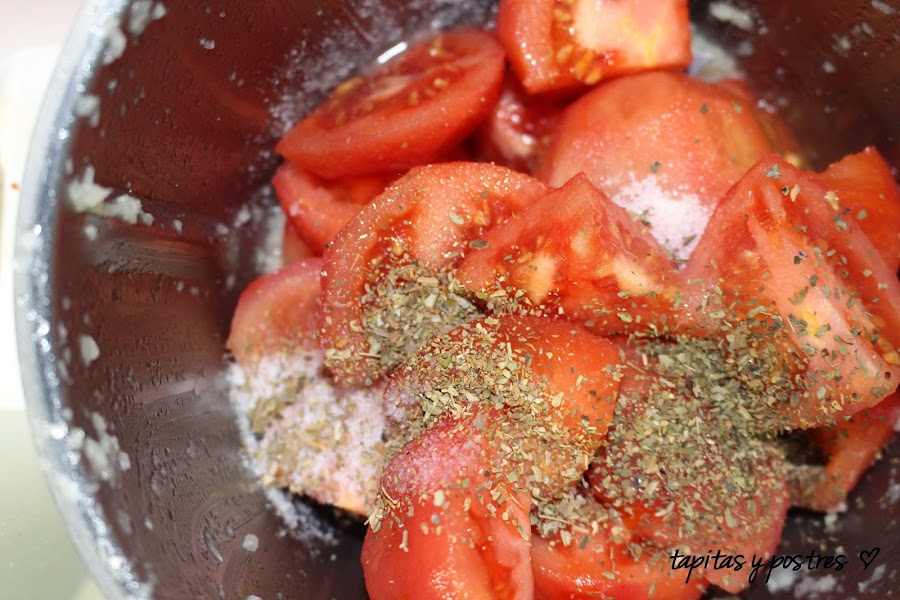 Agregamos los tomates sin piel y a cuartos ( o la lata de tomate triturado) la sal, el azúcar,la pimienta, y las hierbas y cocinamos 20 minutos, varoma, velocidad 1, sin poner el cubilete, sino el cestillo para que no salpique.