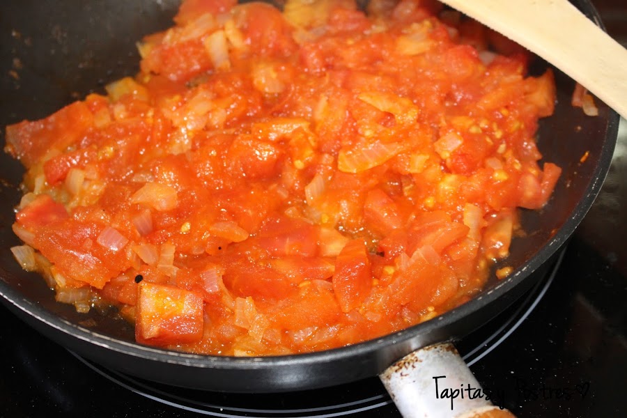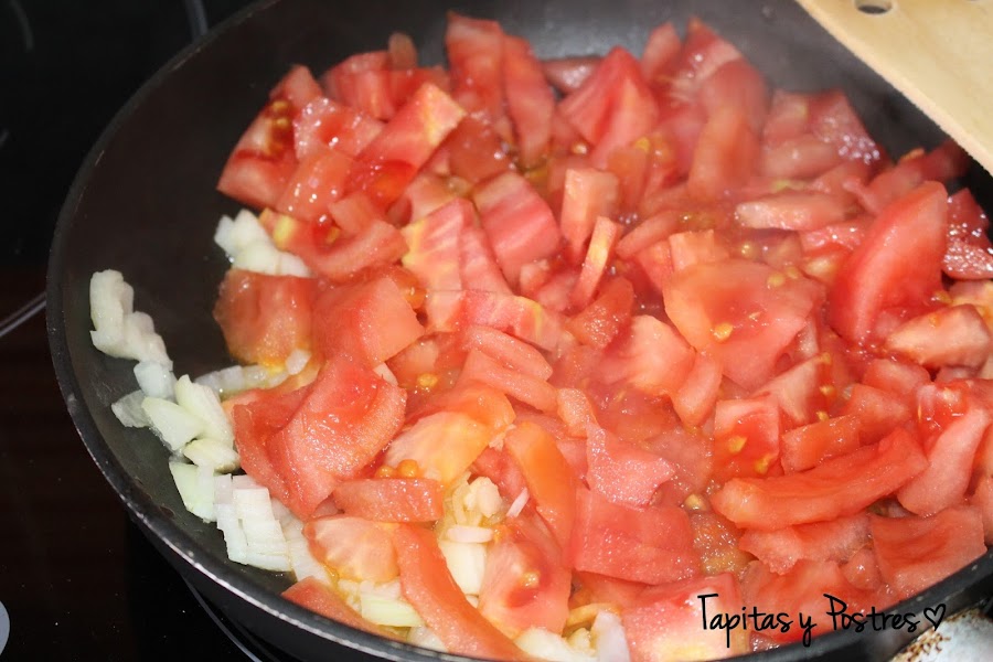 Cuando la cebolla esté casi transparente añadimos el tomate troceado.
