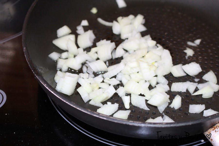 Ponemos un par de cucharadas de aceite de oliva en una sartén y pochamos a fuego lento la cebolla picadita.