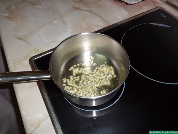 Picamos los ajos muy finitos y los ponemos en un cazo con un poco a aceite a fuego bajo.