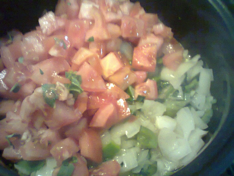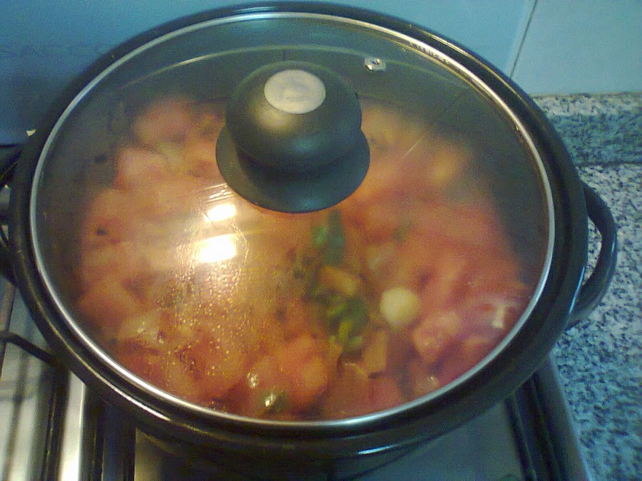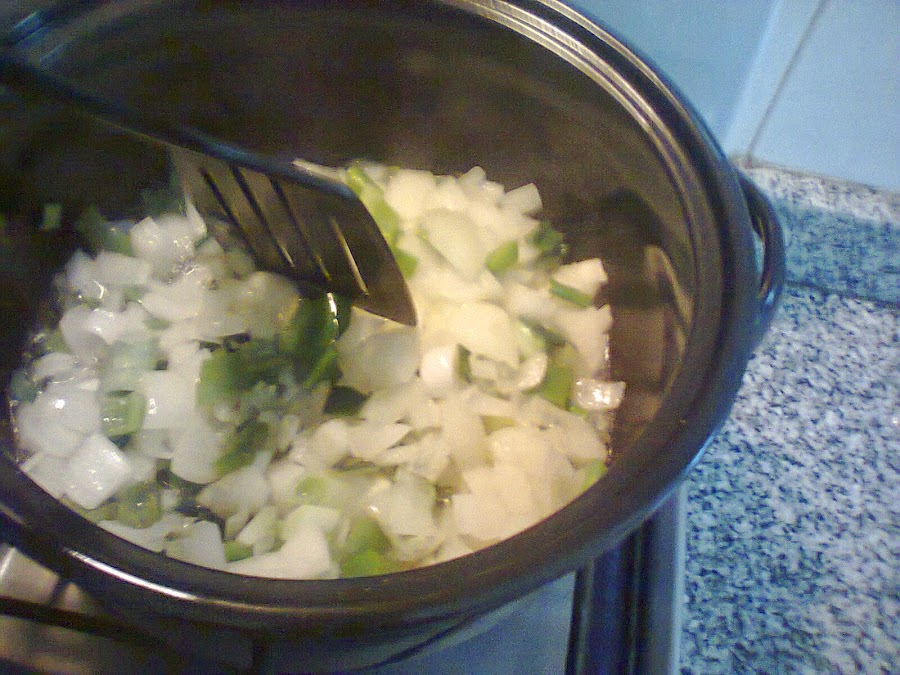 Poner en una olla aceite, calentar a fuego medio, agregar la cebolla, el verdeo y el morrón, todo picado grande, cocinar removiendo para que no se queme hasta que la cebolla este tierna, agregar el tomate picado grande y los condimentos, por ultimo la sal, mezclar, poner el fuego en mínimo y si es necesario un difusor de calor (si no tienes uno puedes usar las tostadoras para pan que se ponen encima de la hornalla), cuando larga el hervor agregarle el vino, tapar y dejar hervir 3 a 5 minutos para que se evapore el alcohol, revolviendo cada tanto para que no se pegue en el fondo.