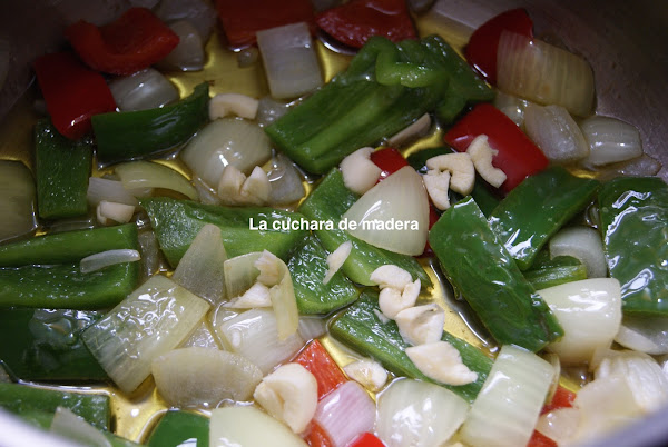 En un caldero, ponemos un poco de aceite de oliva, metemos los pimientos, la cebolla y los dientes de ajo pelados y troceados; lo dejamos a fuego medio/ bajo unos minutos removiendo.