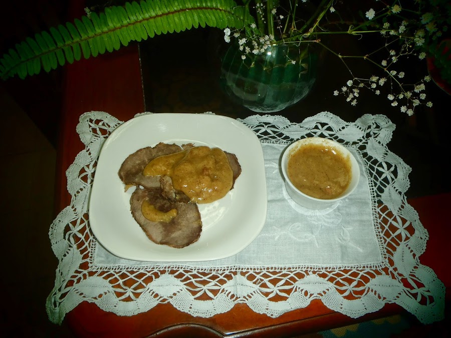pique su tocino y pongalo a freir en una cacerola grande, cuando ya esté doradito agregue la cebolla y saquela del fuego antes de que se dore, saque de la cacerola, su tocino y cebolla y en el aceite que dejó el tocino agregue las 4 cucharadas de harina, dorela a fuego moderado hasta que quede de un tono amarillo o café, pero la harina debe estar doradita y queda como aserrín, ahí entonces agrega aproximadamente 1/2 taza de agua o de caldo de pollo si lo prefiere, es la cantidad de liquido según el espesor que necesite, si la desea más rala agregue 1/4 de taza más de líquido, la mueve constantemente para evitar los grumos, cuando la mezcla está ya espesa saque del fuego, es aproximadamente a los 3 minutos de estar hirviendo, si quiere estar segura que no quedará ningún grumo, pase por un colador su salsa, luego ya colada coloque en su cacerola de nuevo y hiervala con el tocino y la cebolla que ya tiene cocidos. Hierva por 2 minutos y saquela del fuego, esta salsa le servirá para roof beef o el jamón de su preferencia.