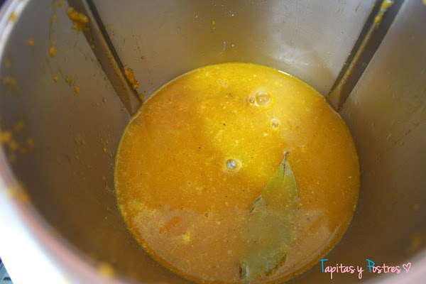 Agregamos el agua, laurel, pastilla de caldo desmenuzada, pimienta y nuez moscada. Y volvemos a cocinar 20 minutos, varoma y velocidad 1.