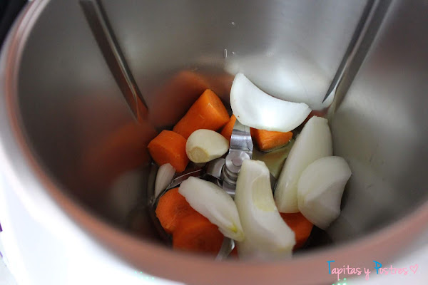 Ponemos la cebolla, zanahoria y ajo en el vaso con el aceite. Trituramos y sofreímos.