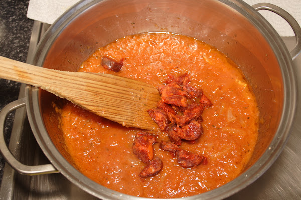Consejo: Pongo el tomate antes que el chorizo para que éste no se quede seco, ni duro. Creo que esta salsa le iría también bien a un arroz blanco.