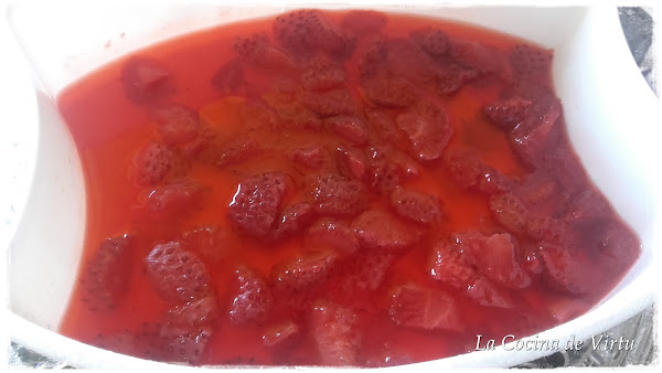 Quitamos el tallo, lo verde, a la fresa, lavamos y troceamos. Colocamos en el recipiente, añadimos el azúcar y el agua. Colocamos en la bandeja de arriba (si ponemos las tres) 20-30 minutos.