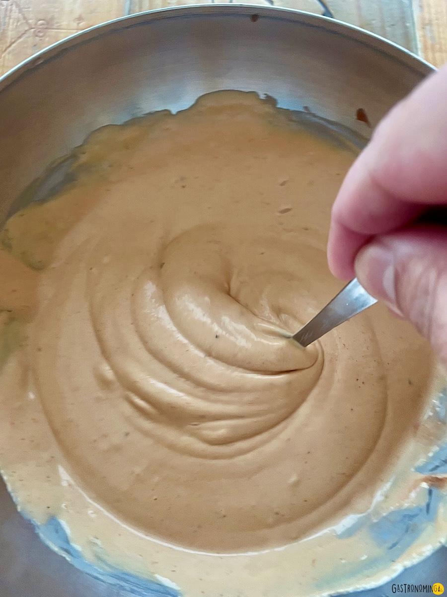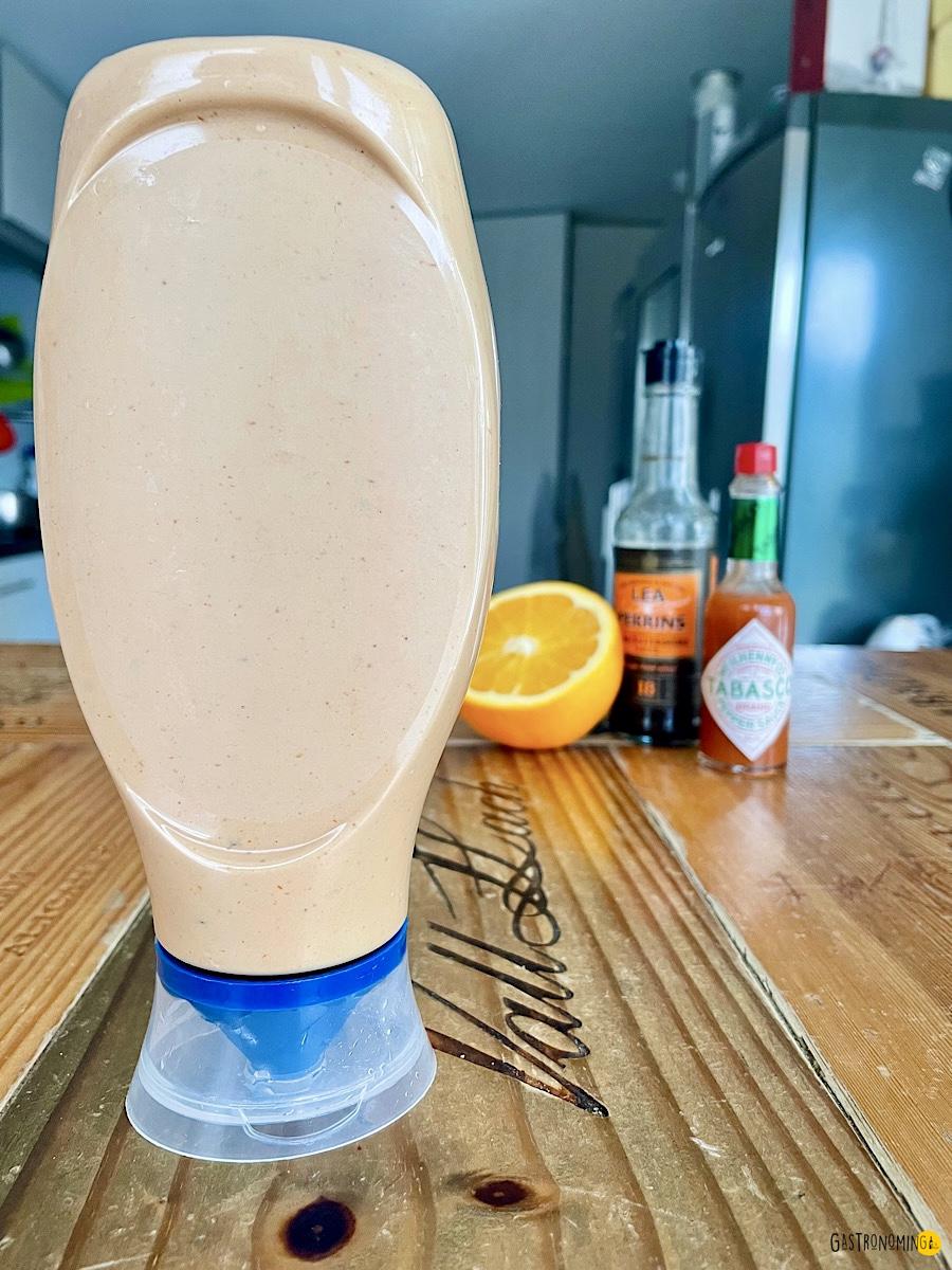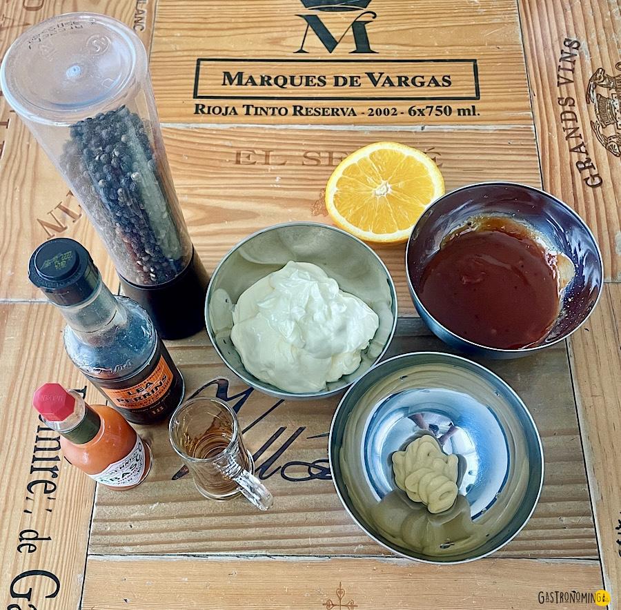 1. Ponemos la mayonesa en un bol y vamos agregando el kétchup y mezclamos bien.2. Añadimos el zumo de naranja y el brandy, mezclamos bien.