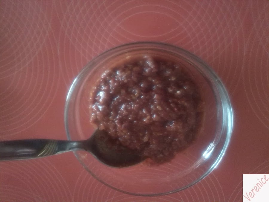 Se bate muy bien hasta que quede una pasta espesa, no hace falta triturarla, debe quedar con trocitos