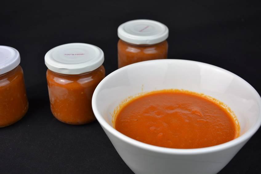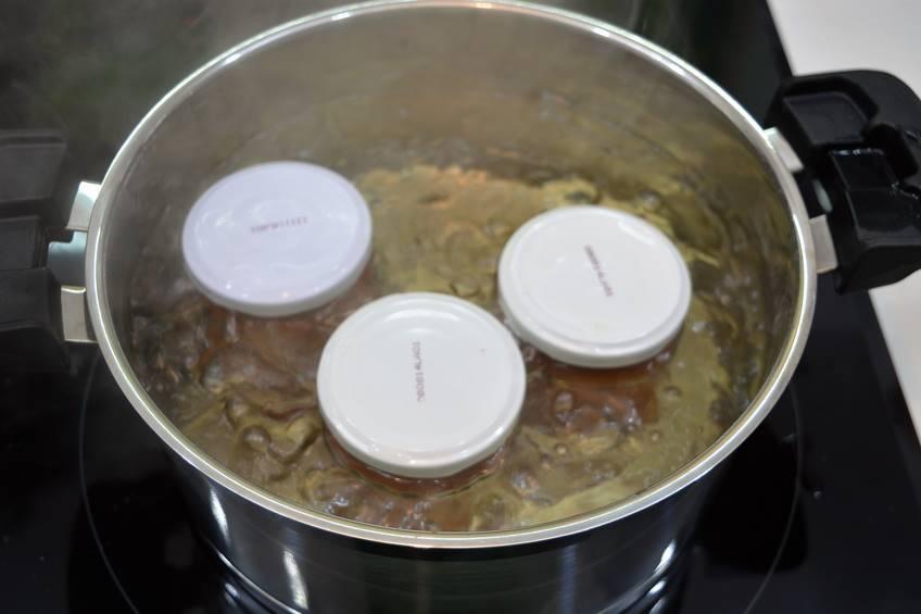Paso 9 Cuando la salsa esté con un espesor de nuestro gusto, la retiramos del fuego y la vamos poniendo en unos botes de cristal para hacer la conserva. Luego en una cazuela con agua hirviendo metemos los botes durante 20 minutos, con eso debería bastar.
