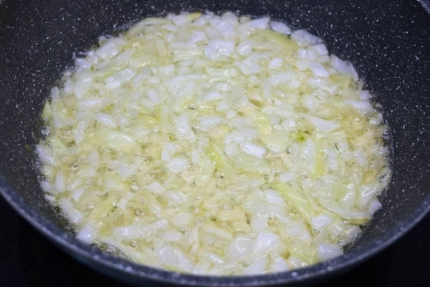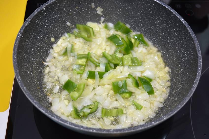 Paso 3 En lo que se va haciendo la cebolla, vamos picando el pimiento y cuando la cebolla comience a transparentar, añadimos el pimiento a la sartén y ponemos un poco de sal.