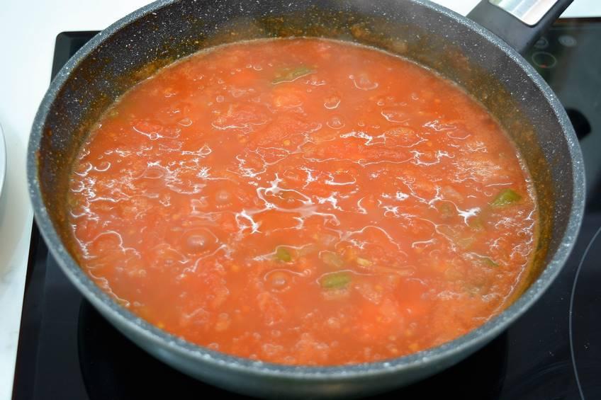 Paso 6 Según se vayan haciendo los tomates, nos será más fácil deshacerlos con una paleta de madera. Cuando el tomate esté completamente deshecho, añadimos un poquito de pimienta negra molida.