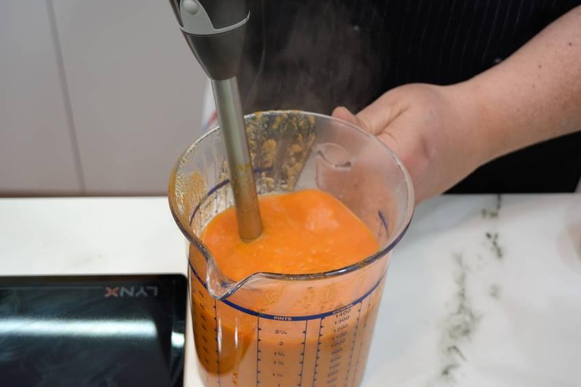 Paso 7 Ahora tenemos que triturar toda la salsa, mientras haya caldo. Sacamos todo a un vaso grande para batir y lo trituramos todo bien.