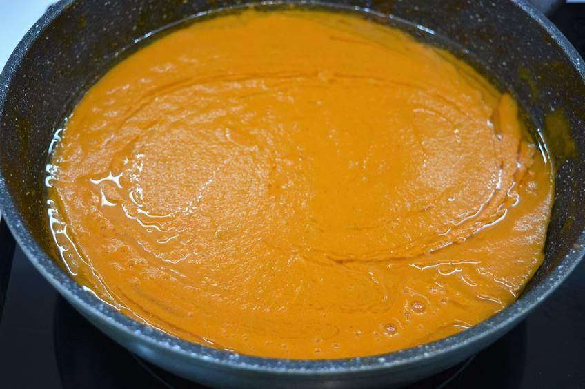 Paso 8 Con la salsa perfectamente triturada a devolvemos a la sartén, en la que habremos puesto un poco de aceite de oliva, para que termine de reducirse a fuego medio-bajo.
