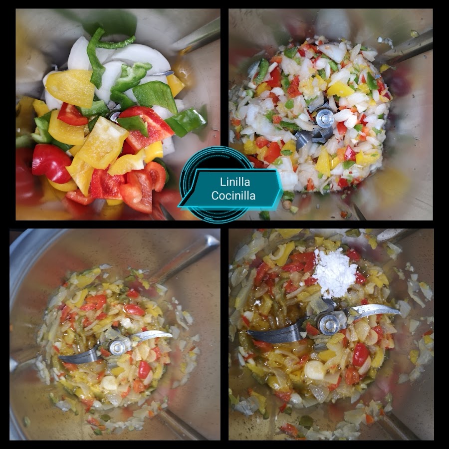 1. Poner la cebolla en cuartos, los pimientos en trozos y los ajos. Programar 4 seg/vel 4. Bajar los ingredientes con la espátula hacia las cuchillas, añadir el aceite de oliva y sofreír 10 min/varoma/giro inverso/vel. cuchara.