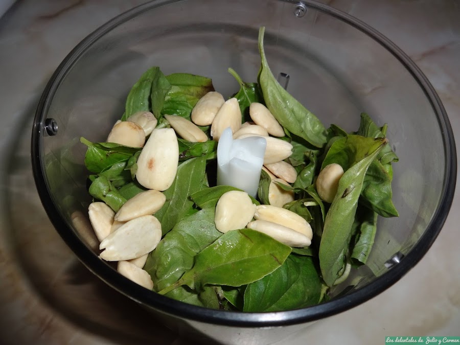 Meteremos en el accesorio picador (o a mano en un mortero) las almendras junto con la albahaca y el diente de ajo y trituraremos un poco.