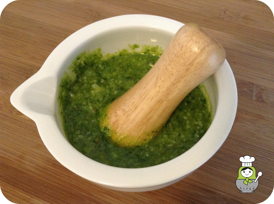 Su nombre se debe a que para hacerlo hay que pestare (machacar) los ingredientes en un mortero.Existen varios tipos de pesto, entre los más conocidos están el trapanés, con tomate y almendra y el genovés, que es el que prepararemos hoy.