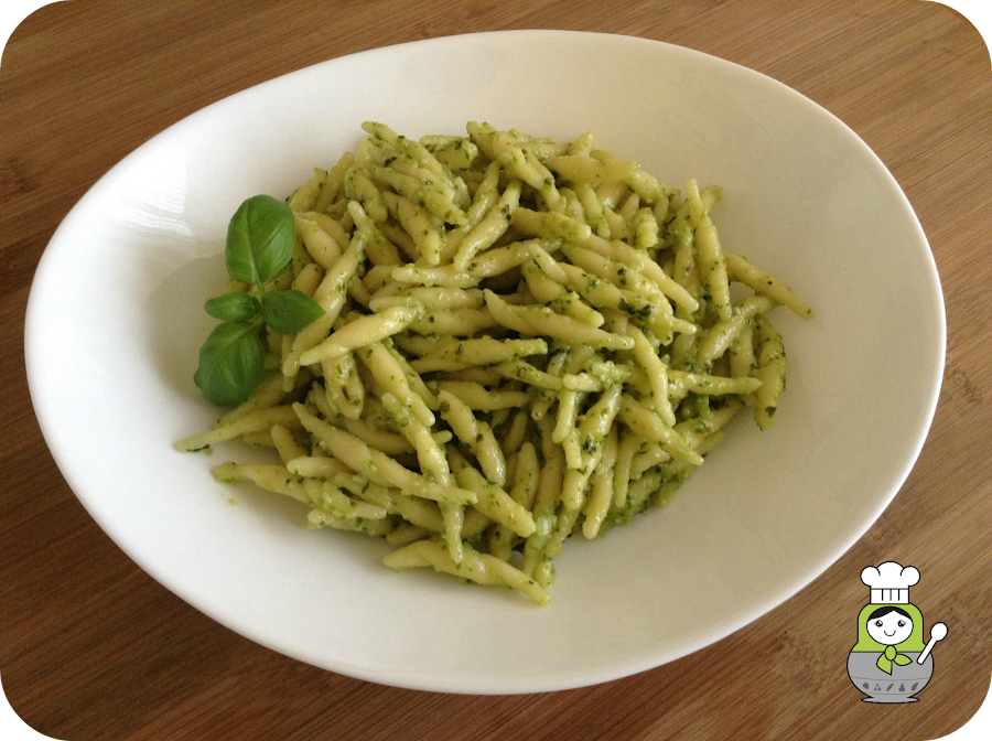 Solo queda cocer la pasta y servir inmediatamente para que no se enfríe. Nosotras hemos decidido que acompañe un buen plato de trofie, como manda la tradición en Liguria pero la verdad es que el pesto va bien con cualquier pasta, tanto corta como larga.