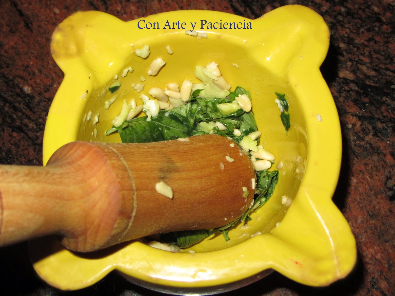 Majamos en un mortero los ajos, albahaca, piñones y sal hasta conseguir una pasta. A continuación, agregamos poco a poco el parmesano y aceite de oliva.