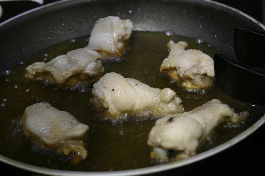 Mientras se pocha, ponemos las alitas en una sartén a fuego fuerte y les damos la vuelta cuando esten bien fritas.
