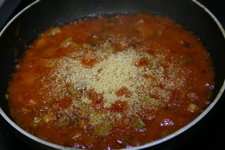 Echamos una cucharadita de pimentón picante y lo movemos durante unos segundos, seguidamente echamos el tomate frito,
