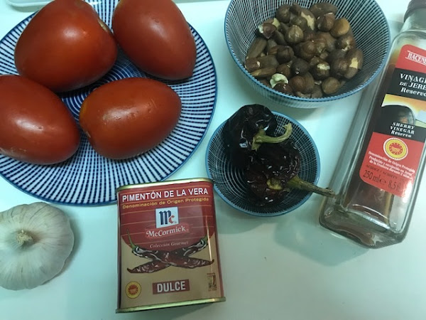 Pon en el vaso 30 gramos del aceite y los ajos pelados, pica 5seg/vel5, baja los restos, añade los tomates troceados y tritura 5seg/vel5, sofríe 5min/100º/vel1, añade el vinagre, el pimentón y la mezcla de almendras, avellanas, ñoras y pan que teníamos reservada, salpimenta y tritura 15seg/vel5-7-10, baja con la espátula los restos y programa vel4 sin tiempo, sobre la tapa vierte despacio el aceite, cuando esté todo el aceite ya puedes vaciar el vaso, la salsa se conserva en un envase hermético y dentro de la nevera.