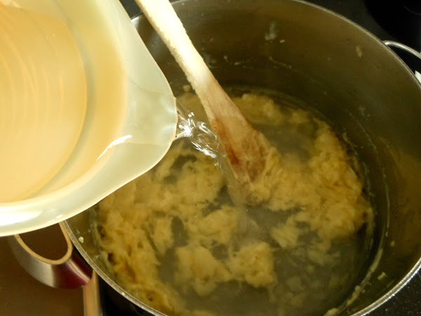 Tras esto, vierte el caldo de pollo o el agua y la pastilla de caldo y vuelve a remover. Deja que la salsa espese a fuego medio-alto (nº 7 de la placa vitrocerámica) durante 10 minutos.