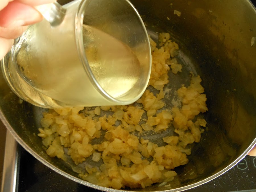 Transcurrido el tiempo vierte el medio vaso de vino blanco seco y remueve constantemente la mezcla durante 2 minutos para favorecer la evaporación del alcohol del vino.