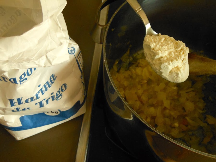 Cuando la cebolla esté tierna, agrega la cucharada sopera de harina de trigo y remueve durante 1 minuto con tu cuchara de madera.