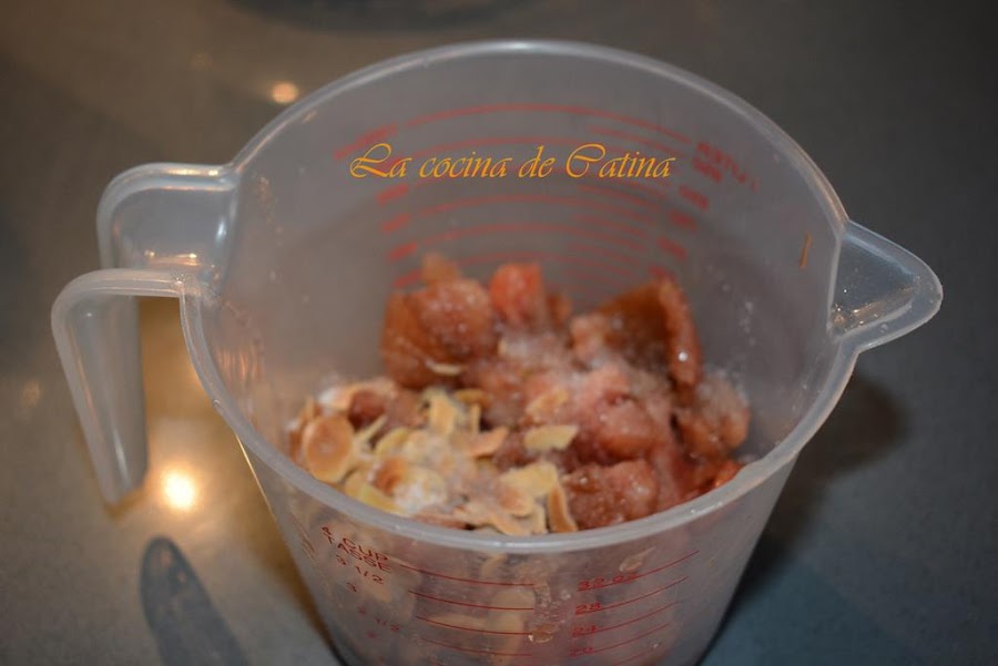 Colocamos las almendras en el vaso de la batidora, añadimos el pimiento, las guindillas, los ajos y los tomates pelados y troceados sin semillas.