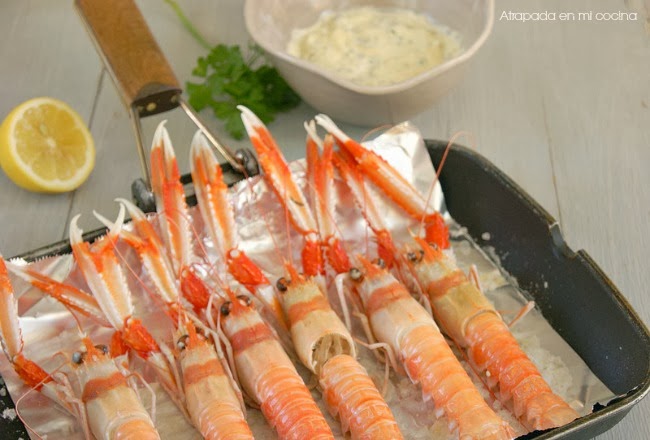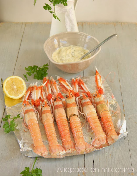 Al llevar mayonesa casera la salsa no podremos guardarla de un día para otro, por lo que sólo haremos la cantidad necesaria. Nosotros a mediodía la acompañamos con estas riquísimas cigalas a la plancha que encontré a muy buen precio en el mercado de Almuñécar (26 ?/Kg). Por la noche la cantidad restante la comimos con salmón ahumado. Nos gustó mucho con ambas elaboraciones.