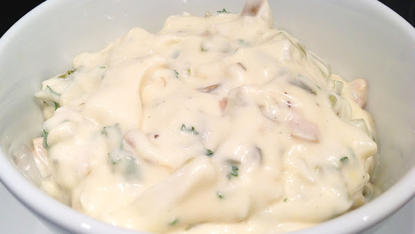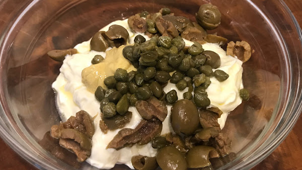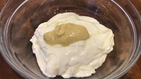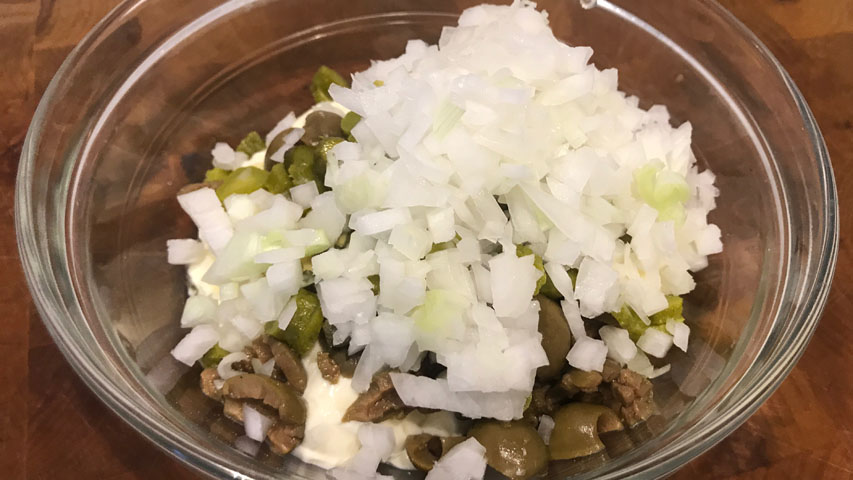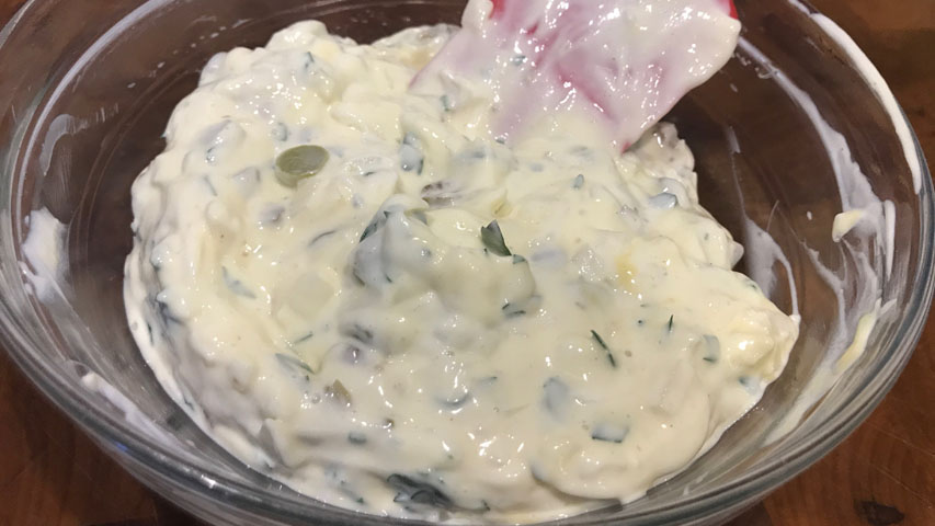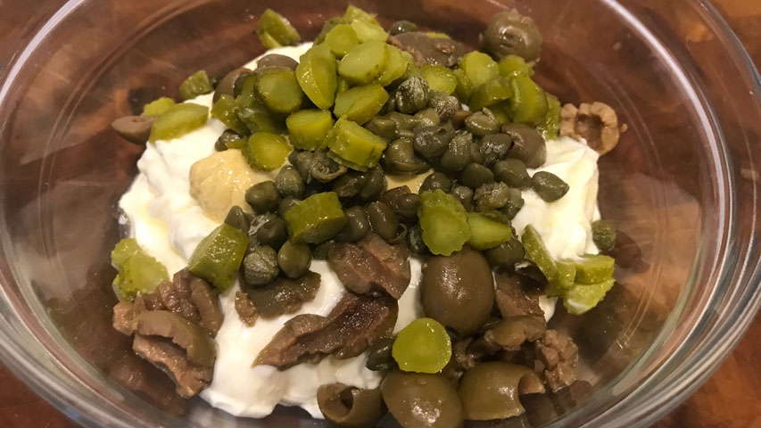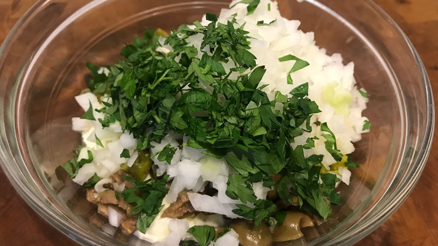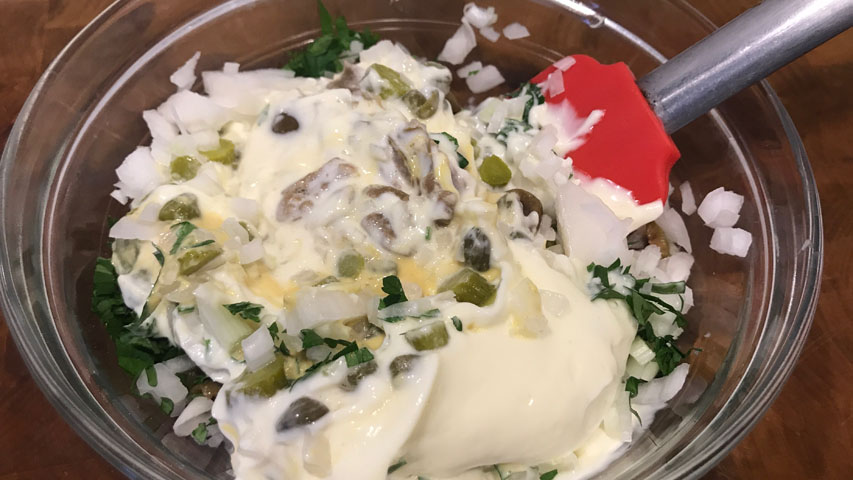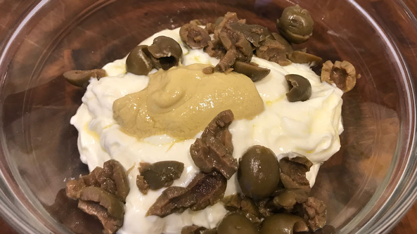 Incorpora la mostaza y el resto de ingredientes picados a la mayonesa.