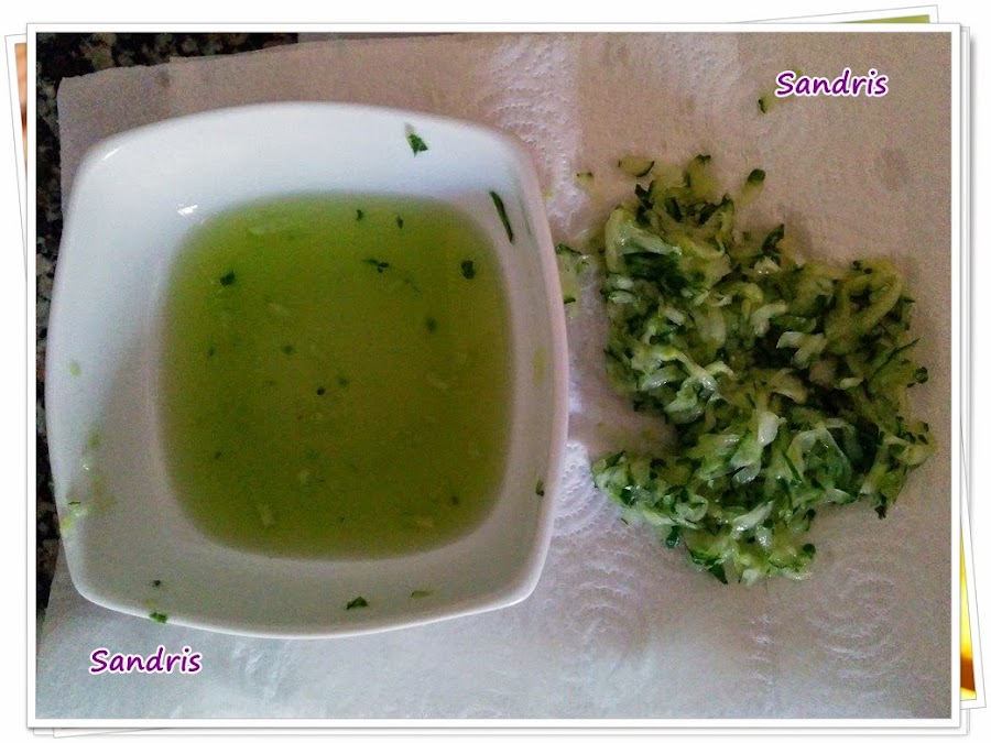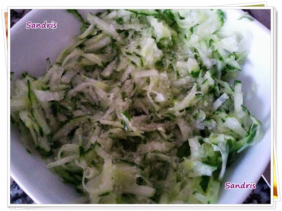 Cebollino (para decorar)Lo primero que tenemos que hacer es rallar el pepino (o pepinos, depende de la cantidad que vayáis a hacer); yo le he dejado la piel porque quería que tuviera otra tonalidad la salsa y combinara con el verde más suave de dentro del pepino. Luego se cuelan para que suelte todo su jugo. Yo los metí luego en un bol y le eché sal gruesa para que termine de soltar toda el agua que tiene, sino la salsa saldría aguada. Una vez vemos que ha soltado todo el agua, los volvemos a escurrir. Yo a parte de usar un colador, usé papel de cocina para secarlos al máximo posible, pero bueno, eso cada uno supongo que tiene sus trucos.